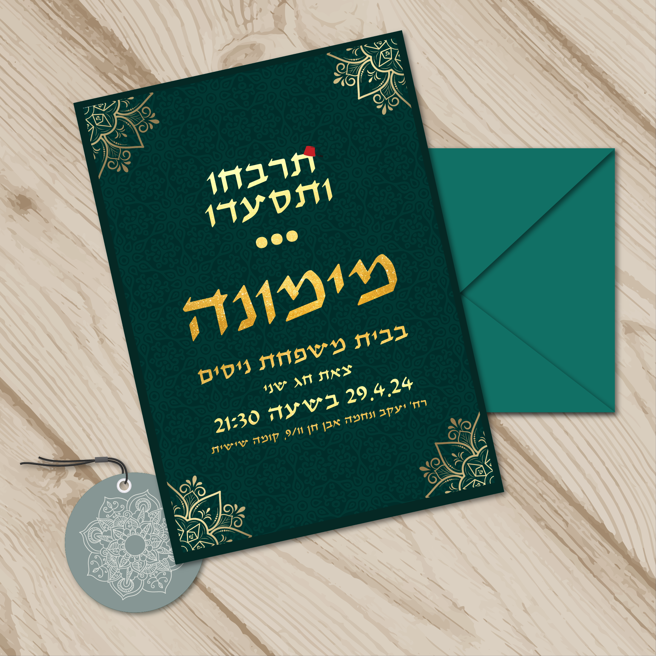 בעיצוב ההזמנה למימונה, שאפתי ליצור שילוב בין מסורת למודרניות, תוך שימת דגש על האווירה החגיגית והצבעוניות העשירה המאפיינת את החג. בחרתי בצבעי ירוק עמוק וזהב כדי לשדר תחושת יוקרה, שמחה ואירוח מסורתי, לצד עיטורים מרוקאיים המעבירים את רוח התרבות הייחודית של החג.